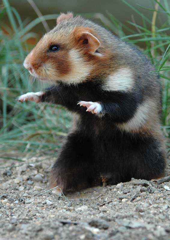 Ein Feldhamster kann bis zu 35 Zentimeter lang werden und bis zu 600 Gramm wiegen. Charakteristisch sind sein buntes Fell und der schwarze Bauch, den der langsame Flüchter auch zur Abwehr einsetzt: Er stellt sich auf die Hinterbeine, bläst die Backen auf und klappert mit den Zähnen. Der dunkle Bauch und die hellen Pfoten erinnern dann an den aufgerissenen Schlund eines Raubtieres mit Reißzähnen. In dieser beeindruckenden Pose stellt sich der Feldhamster seinen Feinden entgegen.